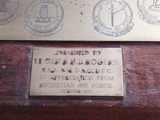 Copper Rhodesian Air Force plaque as presented to Chief of South African Air Force Lt-Gen RHD ‘Bob’ Rogers SSA, SM, DSO, DFC, in appreciation in October 1979.
